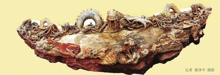 赵成德在采石现场。 长13.9米、宽3.39米、高1.69米、重99吨的“丝路寻梦黄龙玉砚”,台基呈矩形航船,主色为金黄色。 李文祥 包柱生 姜文博 志宏能致远,懿德必生辉。 谁说一腔爱,未润百花开? 久怀凌云志,辗转创伟业。 竞得天歌胜,丝路满天星! 一位饱经沧桑的行吟诗人路过古丝绸之路上的瓜州,与甘肃省洮砚开发公司董事长赵成德不期而遇,在听了其艰难的创业之路后,情不自禁吟出了上述诗篇。 时代潮流,浩浩荡荡,唯有弄潮儿能永立潮头。历史车轮,滚滚向前,唯有奋斗者能乘势而上。在改革开放40年之际,甘肃省洮砚开发公司特制巨型石材砚——“丝路寻梦黄龙玉砚”向伟大祖国和盛世中华献礼。赵成德作为改革开放40年的见证者、创业者、受惠者,这是他又一次圆梦、又一步跨越、又一个创举,具有鲜明的时代特点和深刻的主题寓意。 奋斗的人生是最幸福的,奋斗者的精神是最富足的。40年前,他靠贩卖洮砚迈出了致富的第一步;30年前,他靠雕刻洮砚拥有了自己的实体经济;近20年来,他兴企创业,传承洮砚文化,成为陇上遐迩闻名的实业家。赵成德的人生“三步曲”,也是他奋斗的“三级跳”,更是一个创业者的逐梦历程。 黄龙玉砚再现大漠 “丝路寻梦黄龙玉砚”,昭示着龙腾盛世,祖国兴旺,人民福祉。该砚长13.9米、宽3.39米、高1.69米、重99吨,台基呈矩形航船,主色为金黄色,源自黄河、黄土地、黄皮肤的图腾之色,象征炎黄子孙的尊崇之象,表征中华民族的繁荣兴旺之气,总体寓意为中国巨轮在改革开放中驶过了波澜壮阔的40年。 借洮砚文化之魅力,还历史之真璞;融艺术之醇厚,铸砚石之精魂。“丝路寻梦黄龙玉砚”构思缜密,设计巧妙,匠心独具,寓意深刻。砚身整体由中华龙、神龟、长江、黄河、浪涛、山脉、祥云、关隘等构件组成;56条龙逶迤起伏,突兀昂首,眺望长城;长江、黄河奔腾流淌,汹涌波涛;千年神龟守望祖国,祥云、海涛,翻滚逐浪。其内涵博大精深,融合龙图腾、历史文化、自然地理、人文景观、民族精神;其雕刻层次分明,精致到位,惟妙惟肖;其寓意多元丰富,自然的、历史的,时间的、空间的,文化的、精神的融为一体,充分彰显了中国开放、发展、和谐的历史伟业。 “丝路寻梦黄龙玉砚”是甘肃省洮砚开发公司40年心血、汗水和智慧的结晶,是40年功力、匠心和艺术的集成,是40年创业、创新和创意的迸发,辗转南北,寻梦阳关,才结出如此绚烂瑰丽的艺术之花,绽放在中国西部的大漠——瓜州。赵成德常说,一座别墅几千万,一辆小车几百万,但经过短短的几十年,这些东西价值锐减,甚至一文不值。但是一方砚台,经过几十年就会成为文物,成为价值激增的艺术收藏品,即使是一方价值仅千元的小洮砚经过几十年几百年价值会有数百倍的增长,时间越长,弥足珍贵,这就是时间的价值,这就是文化的力量。 洮河岸畔长大的诗人包柱生曾作《丝路寻梦黄龙玉砚赋》以颂之: 西域寻梦,继一带一路;巨砚再雕,歌改革开放。经四十载,不畏逆旅长。秉承热望,寻幽隐真经,一意所向。雕琢梦想,筚路蓝缕酬宏愿;面向未来,文化伟业要振兴。沙洲星空,卫星航飞。长城醒狮,塔楼驼队,伶俜萦苦辛,积善能成德,玉龙心愿雕就;丝绸之路,月牙泉明,坎坷亦艰难,迢迢风雨路,献礼四十年。 晾经滩上,石鸣云开,龙龟感应,瀚海深情,砚乡逶迤路;自远方来,为民造福,恩泽如缕。大江大河说风流,洮砚碧透心如镜,金鼎大吕风沙鸣;黄龙玉砚最关情。更倾一往赤诚,常思报国,助力经济腾飞;荣辱与共,惠民大道行。国策乐移民,雄心不已,辗转丝路创伟业;贤才共商榷,发展共享,同圆小康梦。 报人记者颂,俊才豪杰迎,苦舟共济,致富愿相随。赵氏凌云志,九死犹未悔,餐风露宿,戈壁一觉醒。传承文化,弘扬国粹,功莫大焉;铸就产业,造福于民,善莫大焉! 千回百转洮砚梦 一块砚材,犹如一张白纸,可绘就人生的蓝图; 一块砚材,犹如一片料板,可搭建事业的高地; 一块砚材,犹如一个平台,可树起文化的丰碑。 从大山深处走向大漠瀚海,从甘肃岷县来到河西瓜州,念去去千里烟波,暮霭沉沉,大漠天高路远,行至艰难处,回望身后故乡,别有一种说不出滋味。瓜州确为开放、包容、发展之地,瓜州政府和人民处处施以关爱与恩情,瓜州县境内的特殊砚材(黑山石嘉峪石)绝世罕见……把握机遇,顺势而为,开拓创新,赵成德开始了新的创业征程。 机遇总给有准备的人,命运钟爱有思想的人。那是三年前的一次敦煌之旅,在赵成德参加丝绸之路(敦煌)国际文化博览会期间,他与移民瓜州的岷县老乡驱车赴一个叫黑风口的地方寻采祁连玉石,偶然间发现了一块巨型黑石。作为一个制砚人,赵成德欣喜若狂,绝好的砚材得之不易,他决心要让这块黑色的巨石绽放出绚丽的艺术之花。 早在1300多年前,玄奘大师怀着求取真经、普度众生的梦想,渡葫芦河、过玉门关,留下了许多脍炙人口的故事传说。在瓜州,有一块晾经石,是玄奘晾经的地方。传说唐朝玄奘从印度取经回来,闯过火焰山,涉水疏勒河,不慎经卷落水,急需晾晒,但见一望无际的戈壁滩酷热难耐,石块被烤得滚烫滚烫,整个戈壁滩好像烧透了的砖窑,悟空一个跟头翻上云端,发现不远处有一座黑油油的黑石山,一打听得知此山叫洞庭山,连忙带师父来到山上,玄奘一看十分满意,指着一块黑油油的大石头说:“这块石头正是晾经的好地方,你们赶快打开经卷摊开晾晒。”很快,