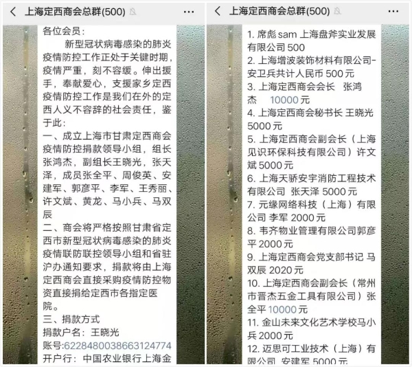 连日来,不管是清晨,还是深夜,有着500多人的上海定西商会总群一直不停的有信息在叮铃声中跳出。 “商会会长张鸿杰10000元” “迈克思工业技术(商会)有限公司安建军5000元” “一个不留名的陇西赵家人1000元” ...... “自从商会秘书处发出‘万众一心众志成城!助力家乡打赢疫情防控攻坚战捐款爱心接龙’的号召后,这个远在繁华大都市的微信群总是处于消息‘轰炸’状态,截至2月9日,捐款累计达11.5万元。在这份爱心接龙名单里有民营企业家、大学教授、医院护士,有打工者、大学生,甚至有以刚出生小孩名义的,在沪干事创业的定西人都想奉献自己的一片爱心,助力家乡抗击疫情”商会秘书长王晓光欣慰地介绍说。 “我们会按照大家的意愿,把捐款全部采购成口罩、消毒液等紧缺的医疗物资直接捐赠给家乡各县区的医院,把大家的爱心第一时间送到疫情一线去”。 战“疫”打响,我们“责无旁贷”